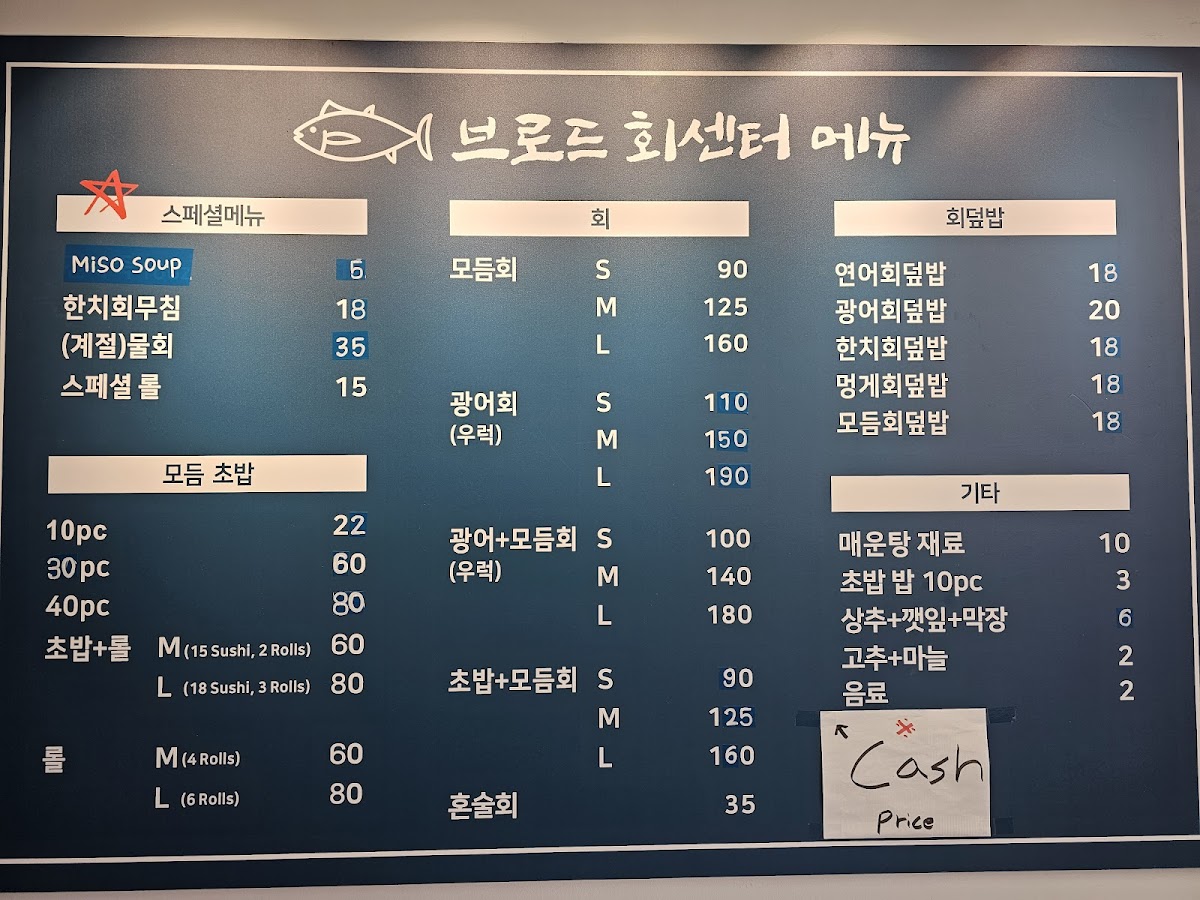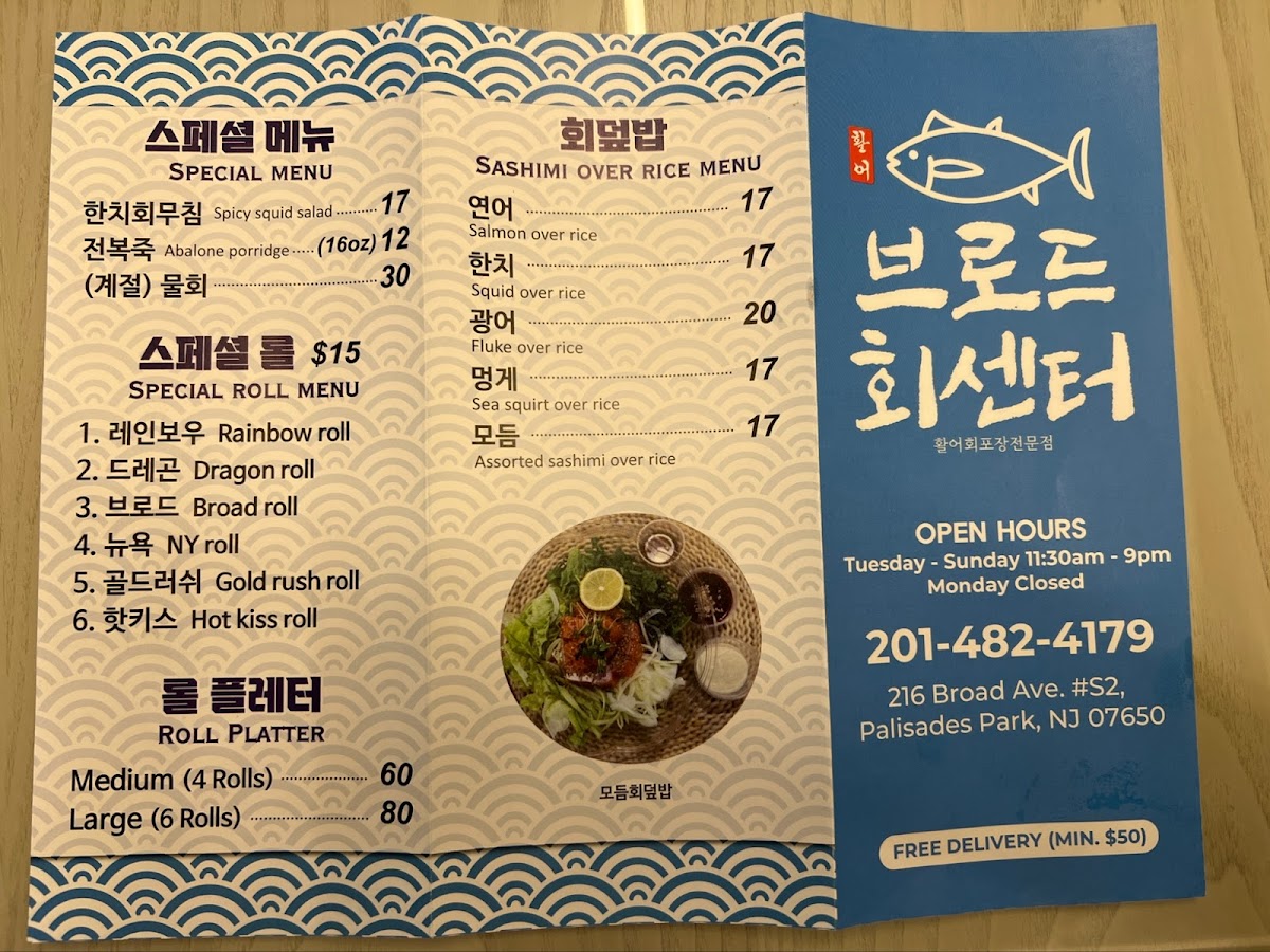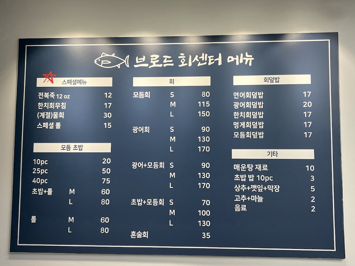 The menu at 브로드 회센터 Broad Seafood Center offers a straightforward selection focused on fresh, quality seafood prepared for takeout. You’ll find a variety of sushi and sashimi options, ranging from individual servings to platters meant for sharing. The style is simple but thoughtful, with dishes like salmon sushi, assorted fish over rice and vegetables, and seasonal specialties that highlight the natural flavors of the ocean.